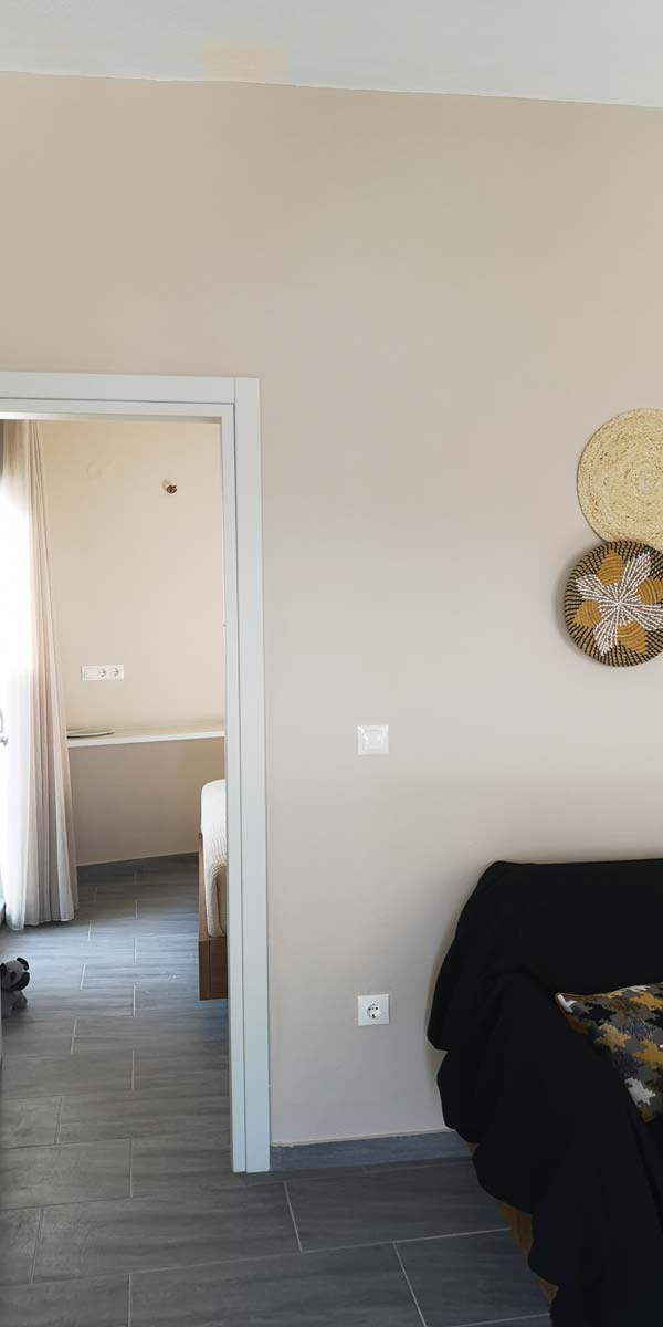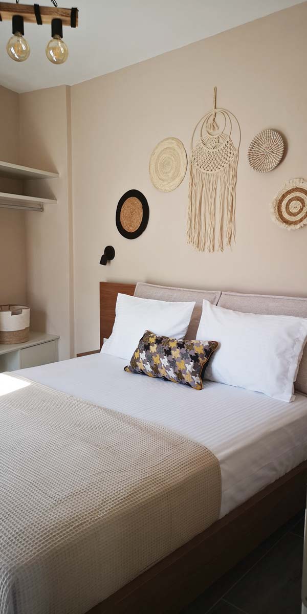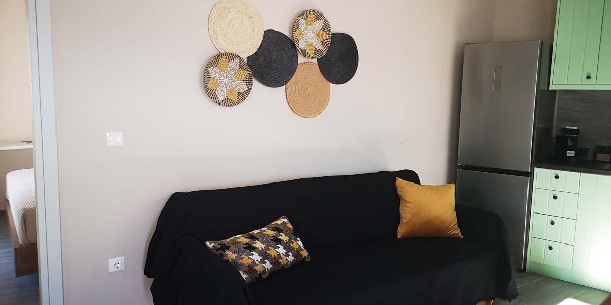 Ένα δίχωρο, μοντέρνο διαμέρισμα στον όροφο με κυρίως υπνοδωμάτιο και πλήρως εξοπλισμένη κουζίνα. Στο χώρο της κουζίνας βρίσκεται και το καθιστικό με τον καναπέ που γίνεται διπλό κρεβάτι. ΄Ενα μεγάλο μπαλκόνι με καθιστικο προσφέρει ανεμπόδιστη θέα σε όλο τον Πλατύ Γιαλό και στην παραλία.